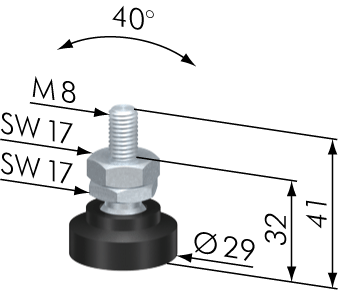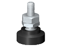 Height adjustable foot for levelling machines and structures. Any tipping is compensated by a ball and a socket.