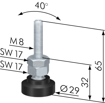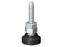 Height adjustable foot for levelling machines and structures. Any tipping is compensated by a ball and a socket.
