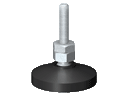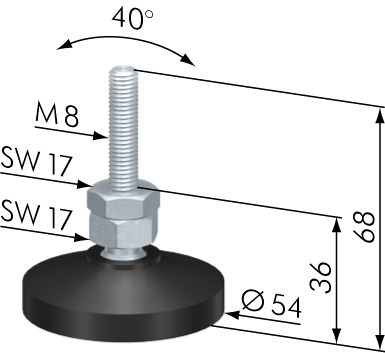 Height adjustable foot for levelling machines and structures. Any tipping is compensated by a ball and a socket.
