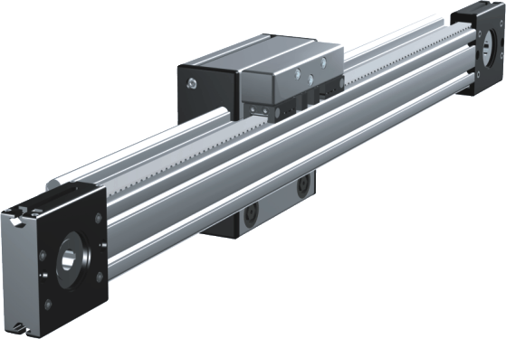 Complete linear actuator inclusive track profile and carriage, pulley assembly with customer-specific motor connection.