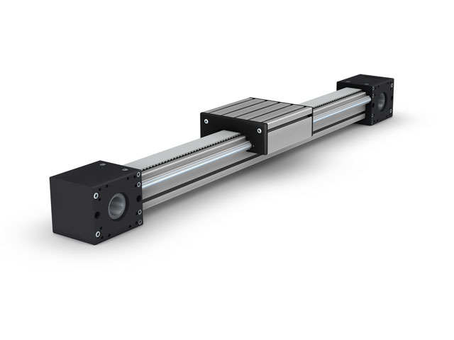 Complete linear axis including guide profile, carriage, wiper and lubrication system, deflection with customised drive shaft connection.