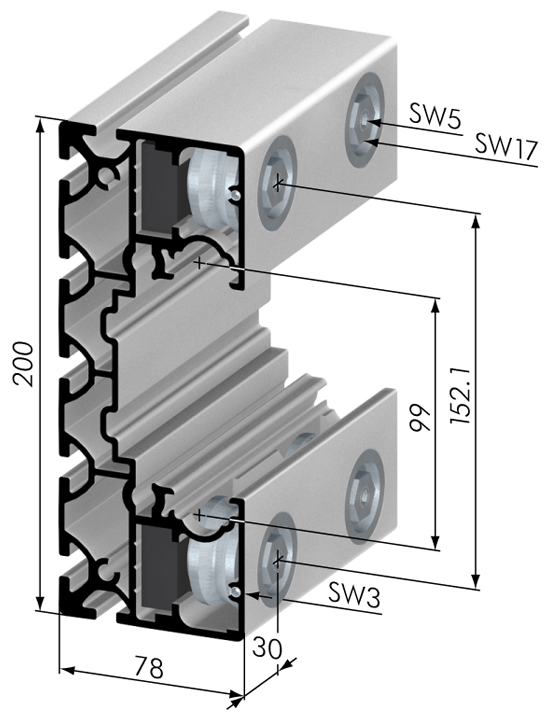 Zur Befestigung der Laufrollen wird ein Aluminiumeinsatz mit Reduzierbuchse in den Laufwagen eingesetzt. Die Redurzierbuchse wird durch zwei Madenschrauben fixiert. Anschließend wird die Laufrolle mit Hilfe der Lagerachse montiert.